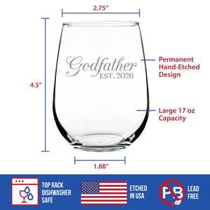 Godfather Est 2026 - Engraved Stemless Wine Glass - New Godfather Gift for First Time Godparents - Decorative Large Wine Glasses - 17 oz
